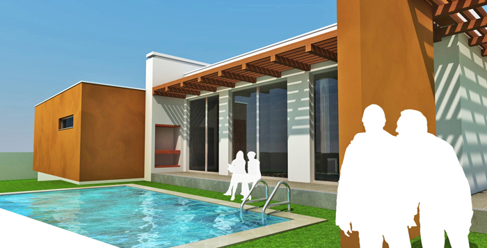 Exteriormente, a área social abre para uma varanda/alpendre com barbecue, ladeada pela piscina. Visualmente a edificação eleva-se à cota da rua, sendo acessível através de rampa. Pretende-se que o restante espaço do terreno não ocupado com a implantação do edifício exista uma zona ajardinada.